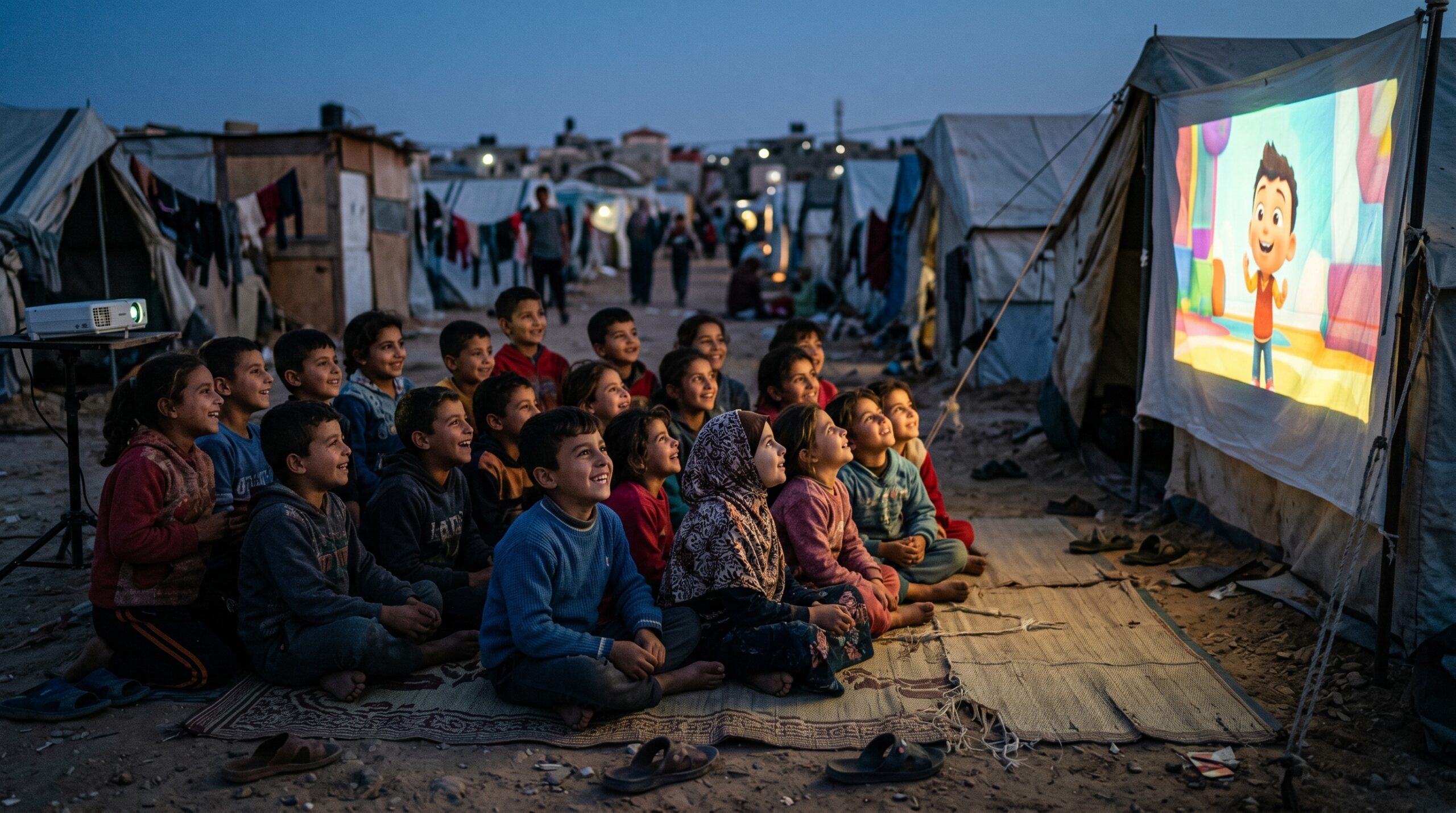 Após cerca de três anos de uma rotina marcada por conflitos, ataques aéreos, escassez de água e alimentos, além da falta de funcionamento de escolas e hospitais — e, em muitos casos, até da ausência de um local seguro para dormir — algumas crianças na Faixa de Gaza tiveram um raro momento de alívio ao conseguirem assistir a um desenho animado projetado em um telão improvisado montado junto a um campo de refugiados dentro do enclave.